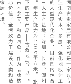 古象地板是湖南古象家居有限公司旗下的品牌,是專注于生產(chǎn)實(shí)木、多層、強(qiáng)化地板的木地板廠家,目前國內(nèi)包含三大生產(chǎn)基地:深圳、長沙、湖州。年生產(chǎn)能力為400萬平方米。品牌成立多年以來,以強(qiáng)大的實(shí)力和盡善盡美的產(chǎn)品以及誠信經(jīng)營獲得廣大用戶和合作伙伴滿意和信任,古象地板已經(jīng)廣泛應(yīng)用于國內(nèi)各大城市的樓盤、酒店、公共區(qū)域。